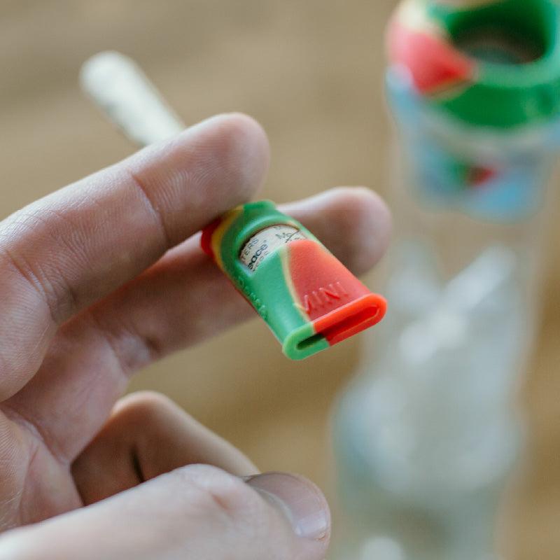 The MouthPeace Mini works reversibly, with one side designed to fit a standard preroll while the other can fit larger blunts, vapes, and even smaller pipes and e-rigs. The silicone is slightly angled to form an airtight seal and can be pinched or stretched around whatever you’re smoking.