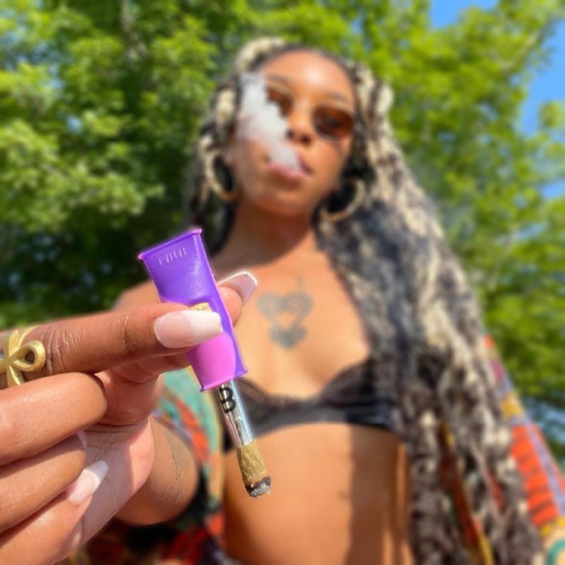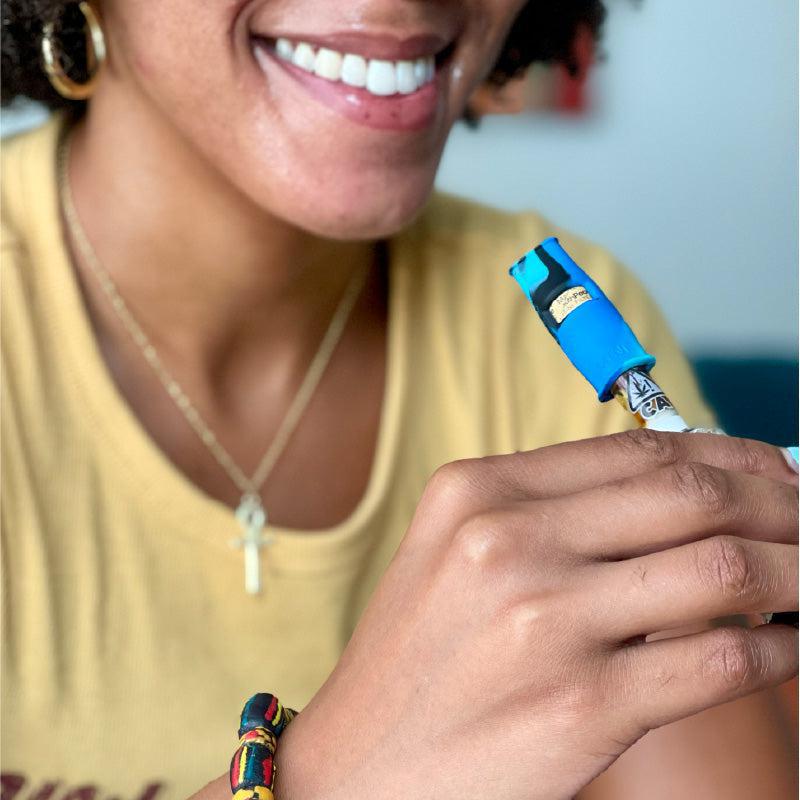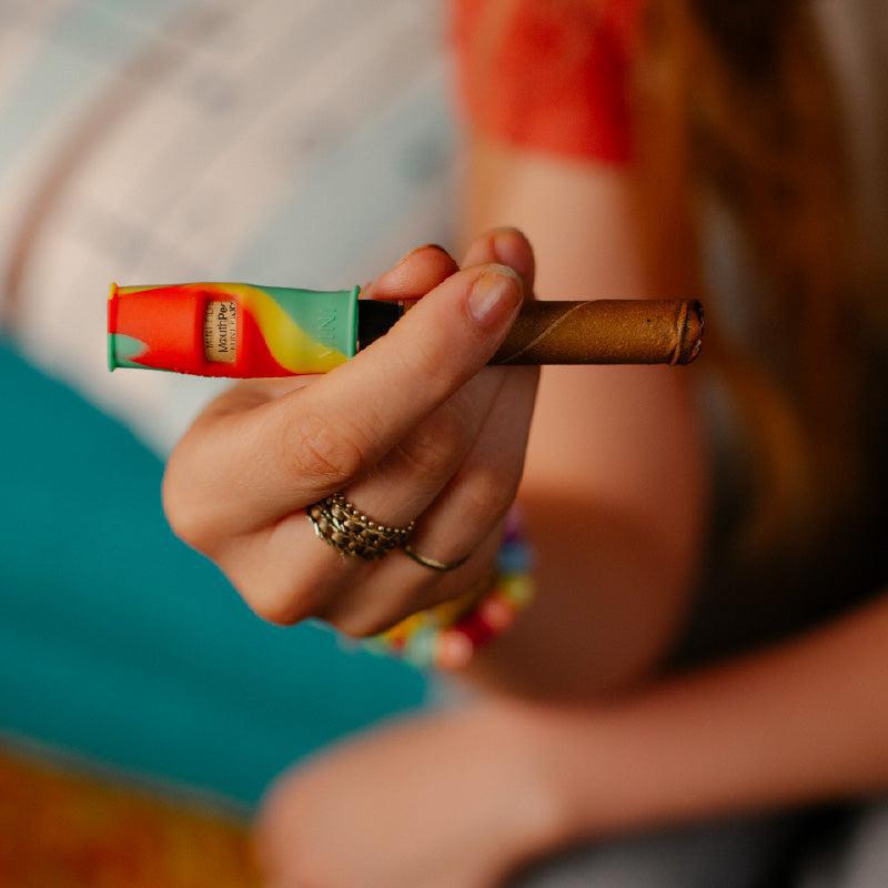 The MouthPeace Mini works reversibly, with one side designed to fit a standard preroll while the other can fit larger blunts, vapes, and even smaller pipes and e-rigs. The silicone is slightly angled to form an airtight seal and can be pinched or stretched around whatever you’re smoking.